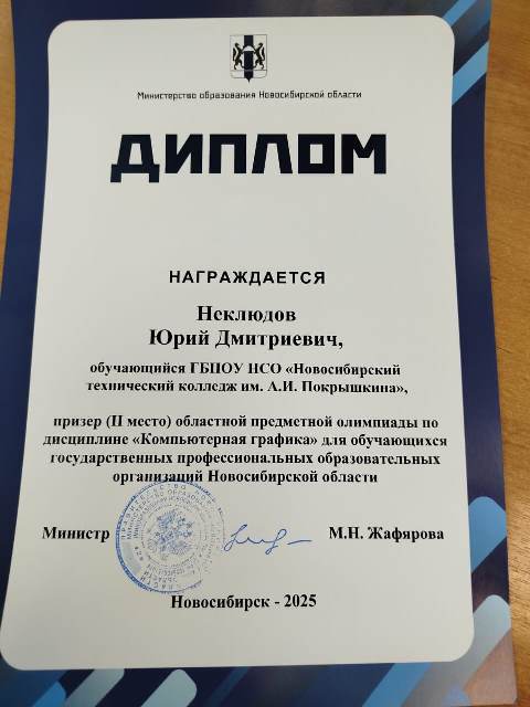 20 марта 2025 года студенты колледжа Неклюдов Юрий, группа АТ-381 и Челноков Сергей, группа ПУ-201 приняли участие в областной предметной олимпиаде по дисциплине «Компьютерная графика» для обучающихся государственных профессиональных образовательных организаций Новосибирской области.