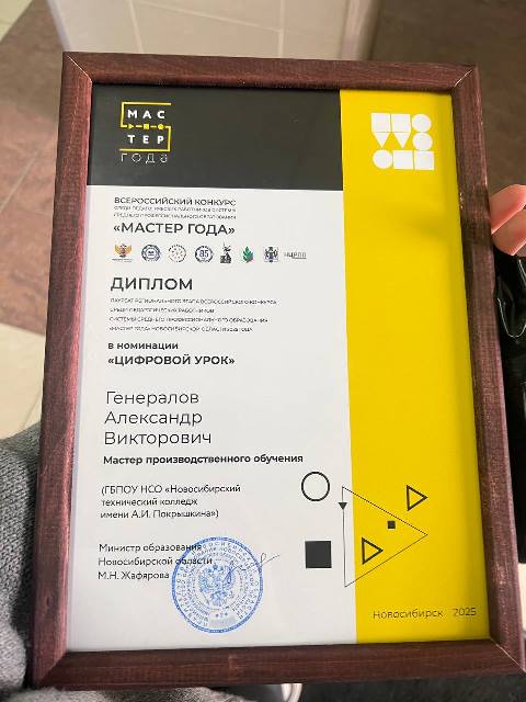26 марта 2025г. состоялось торжественное подведение итогов Регионального этапа Новосибирской области конкурса "Мастер года-2025". Среди победителей особо выделился мастер производственного обучения Новосибирского технического колледжа им. А.И. Покрышкина Генералов Александр Викторович, который одержал победу в престижной номинации "Цифровой урок".