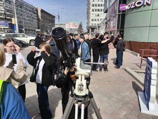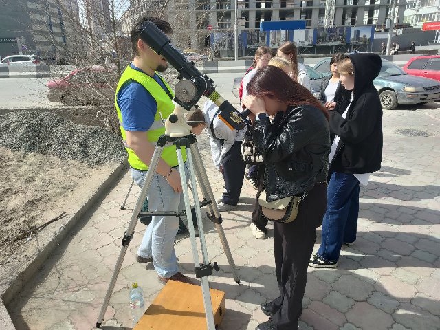 После этого гости прошли на площадку астрономических наблюдений, где смогли взглянуть в телескоп на солнце и даже рассмотреть протуберанцы на его поверхности.