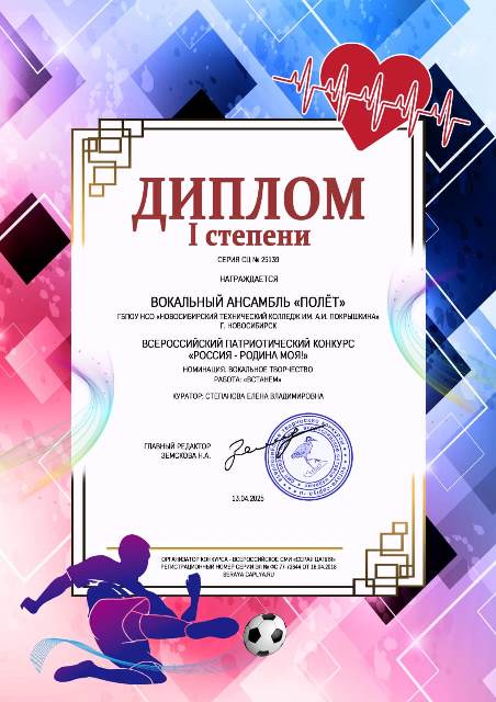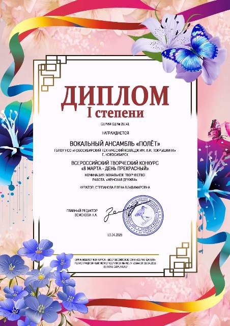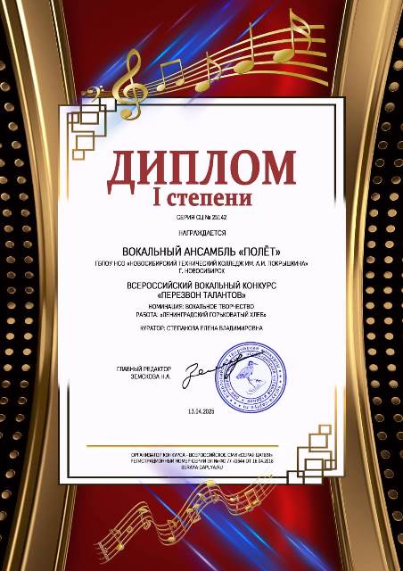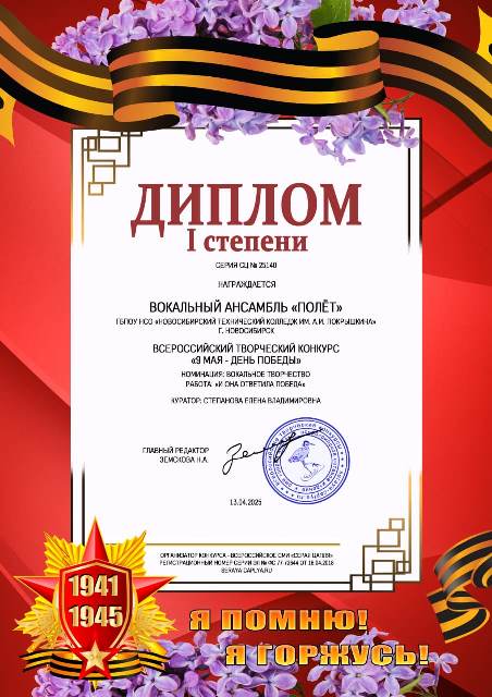 Вокальный ансамбль «Полет» Новосибирского технического колледжа им. А. И. Покрышкина принял участие в нескольких Всероссийских творческих конкурсах: «Перезвон талантов», «8 марта – день прекрасный», Россия – Родина моя», «9 мая – День Победы».