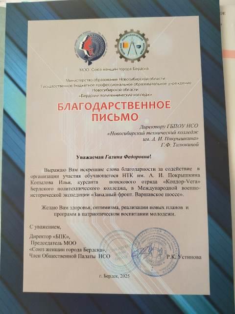 Основная цель экспедиции - поиск и выявление неизвестных воинских захоронений и непогребенных останков защитников Отечества, погибших в годы Великой Отечественной войны. Студент Новосибирского технического колледжа им. А.И.Покрышкина Илья Копылов второй год принимает участие в работе поискового отряда «Кондор-Vега». Начиная с 2023 года, поисковый отряд «Кондор-Vега» побывал в экспедициях по поиску и поднятию останков советских воинов на территории Бельского района Тверской области. В этом году курсанты отряда впервые участвовали в Международной военно-исторической экспедиции «Западный фронт. Варшавское шоссе», которая проходила в деревне Цветовка Барятинского района Калужской области. С большим вниманием слушали участники встречи рассказ о работе поискового отряда. Эмоции и волнение охватили всех, когда на экране шли кадры торжественного захоронения найденных в экспедиции 196 останков защитников Родины. Директор Бердского политехнического колледжа, член Общественной Палаты Новосибирской области, председатель Правления местной общественной организации «Союз женщин города Бердска» Раиса Константиновна Устинова поблагодарила каждого участника отряда за проявленную силу воли, старание и уважение к истории Великой Отечественной войны. Все курсанты отряда были награждены сертификатом участника «Международной военно-исторической экспедиции «Западный фронт. Варшавское шоссе» и медалью «Памятный знак местной общественной организации Союза женщин города Бердска «Белый журавль». Во время встречи директор Новосибирского технического колледжа им. А. И. Покрышкина Галина Талюкина отметила важность участия молодого поколения в поисковой деятельности, направленной на воспитание гражданственности и патриотизма. «Война не закончена, пока не похоронен последний солдат», — сказал великий полководец Александр Суворов. Впереди у отряда новые занятия, изучение военного дела, подготовка к новой экспедиции 2026 года.