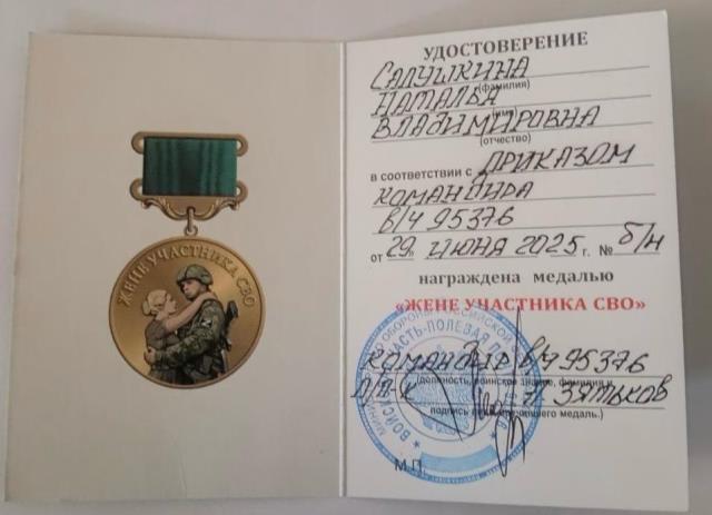 Прошедшим летом свою награду получила и сама Наталья Владимировна. Приказом командира воинской части, где служит Виктор Владимирович, она награждена медалью «Жене участника СВО»! Сколько бессонных ночей, беспокойных дней уже прожито в ожидании весточки от любимого мужа, сколько переживаний выпало на женскую долю – знает только Наталья Владимировна и ее семья, а сколько еще впереди тревог и волнений, сколько еще предстоит преодолеть – не знает никто....