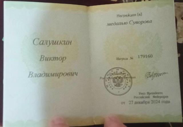 В этом году, накануне дня Защитника Отечества, Приказом министра обороны РФ Виктор Владимирович Салушкин был награжден медалью Суворова за личное мужество и отвагу, проявленные при защите Отечества и государственных интересов Российской Федерации. А несколько дней назад из рук командования он получил сразу две награды: медаль «За боевые отличия» - за заслуги, проявленные в боевых условиях и при проведении специальных операций в условиях, сопряжённых с риском для жизни; медаль «Участнику специальной военной операции».