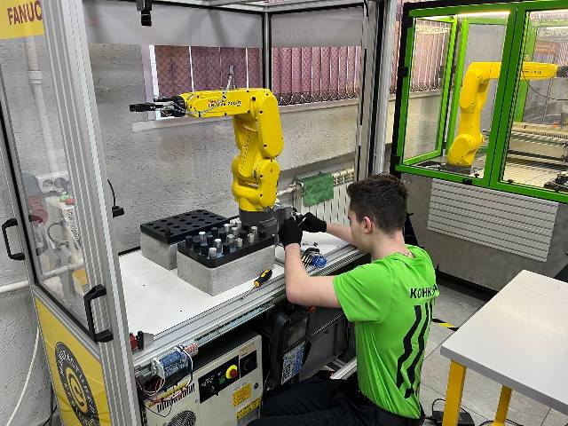 На площадке «Монтаж и обслуживание промышленных роботов» соревнуется 5 команд. В течение 3 конкурсных дней конкурсантом предстоит монтаж и обслуживание роботизированного технического комплекса. Задача конкурсантов – спроектировать комплект оборудования, произвести сборку РТК, произвести подключение пневматики и электроприборов, создать тестовую программу для проверки всего периферийного оборудования. В первый конкурсный день конкурсанты выполняют 5 модулей и производят его настройку.