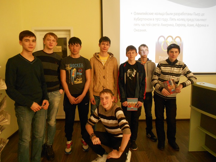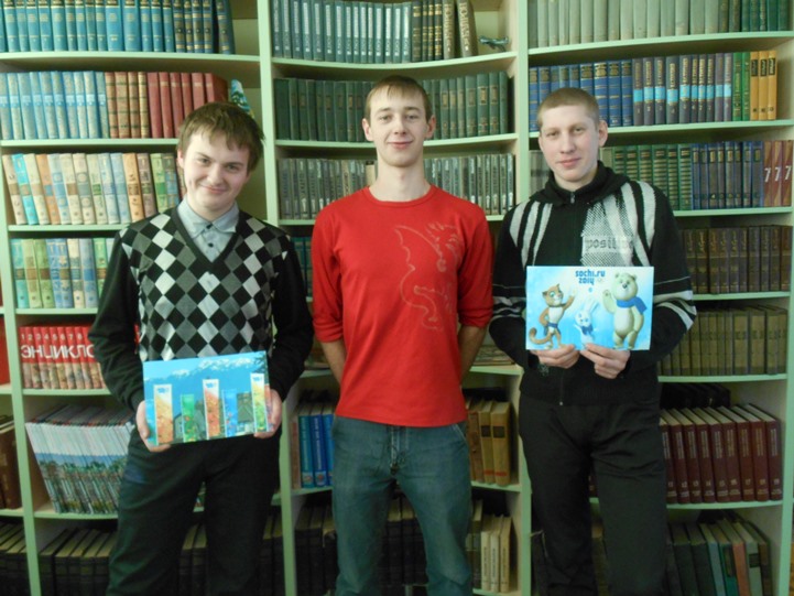 7 февраля в нашей стране состоится мероприятие мирового масштаба – открытие Зимних Олимпийских игр в Сочи. К этому событию приурочены библиотечные уроки в группах 1 и 2 курсов. Сегодня такие занятия прошли в группах ЭГ-11, М-151 и С-212.Заведующая библиотекой Юлия Викторовна Тарасова рассказала студентам об истории Олимпийских игр, о символике, талисманах, об известных олимпийцах, о зимних олимпийских видах спорта, о новосибирских спортсменах, которые будут участвовать на Олимпиаде в Сочи, о Паралимпийских играх, о волонтёрском движении. Ребята посмотрели фильм о значении Олимпиады в Сочи для России. Затем поучаствовали в викторине. Лучшими оказались Николай Колоколов, Даниил Морозов (ЭГ-11), Антон Негодаев, Роман Высоцкий (М-151). Победители получили призы с символикой Олимпийских игр. Все студенты остались очень довольны проведённым мероприятием, вспоминали, как наблюдали эстафету Олимпийского огня. Все с нетерпением ждут открытия Олимпиады в Сочи, чтобы болеть за наших российских спортсменов.