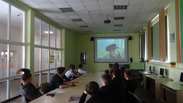 19 марта студенты группы АТ-182 посмотрели и обсудили военную драму «Иди и смотри» (1985). Картина основана на документальных фактах и обращается к «Хатынской повести» Адамовича. Авторами выбрано именно то место и те события, которые стали символом народной беды и страдания. Флера — шестнадцатилетний мальчишка, откопавший среди обрывков колючей проволоки, ржавых пулеметных лент и простреленных касок карабин, и отправившийся в лес к партизанам. В начале фильма он совсем ребенок. В конце, пройдя через ужас карательной акции фашистов, становится взрослым, пугающе взрослым и даже — старым. Война исказила когда-то нежные, детские черты и превратила их в старческие морщины.