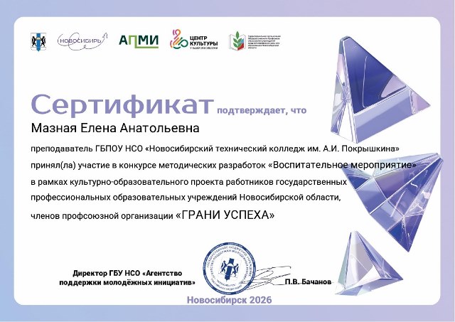 Педагоги Новосибирсого технического колледжа им. А. И. Покрышкина: Елена Анатольевна Мазная и Александра Андреевна Скоробогатова приняли участие в культурно-образовательном конкурсе «Воспитательное мероприятие» в рамках культурно-образовательного проекта работников государственных профессиональных образовательных учреждений Новосибирской области, членов профсоюзной организации «ГРАНИ УСПЕХА».
