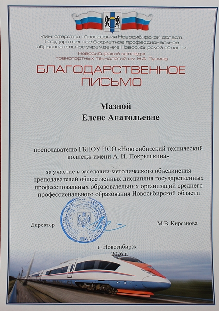 2 апреля 2026 года в 13.30 преподаватель истории и обществознания Елена Анатольевна Мазная посетила заседание методического объединения преподавателей общественных дисциплин профессиональных образовательных организаций Новосибирской области.