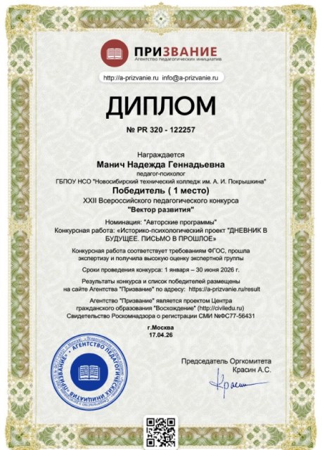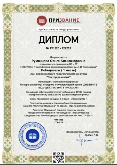Педагоги колледжа приняли участие во Всероссийском профессиональном конкурсе педагогического мастерства «Вектор Развития» с проектами «Дневник в будущее. Письмо в прошлое» и «Хроники СВО: КНИГА ПАМЯТИ – КОЛЛЕДЖ ПОКРЫШКИНА» в номинациях: «Патриотическое воспитание» и «Авторские программы», оба проекта получили высокую оценку жюри, документы о соответствии ФГОС.