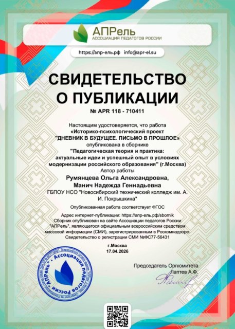 Так же оба проекта получили экспертную оценку Ассоциации педагогов России «АПРель» и будут опубликованы в сборнике «Педагогическая теория и практика: актуальные идеи и успешный опыт в условиях модернизации российского образования» (г.Москва)