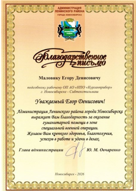 21 апреля студенты Новосибирского технического колледжа им. А.И. Покрышкина из группы СВ-314 были награждены Благодарственными письмами администрации Ленинского района за волонтерскую деятельность для участников СВО.
