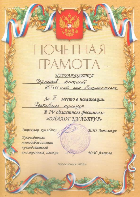 24 апреля 2014 г. студенты нашего техникума приняли участие в четвертом Областном фестивале иностранных языков «Диалог культур». Фестиваль организован Областным методическим объединением преподавателей иностранного языка г. Новосибирска и области. Место проведения - Новосибирский промышленно-экономический колледж.