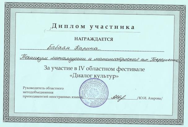 Карина Бабаян была награждена дипломом участника в областном фестивале «Диалог культур».