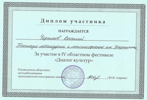 Члены жюри оценили работу преподавателя иностранного языка Ольги Андреевны Погребняк, наградив ее благодарственным письмом за качественную подготовку студентов к 4 областному фестивалю «Диалог культур».