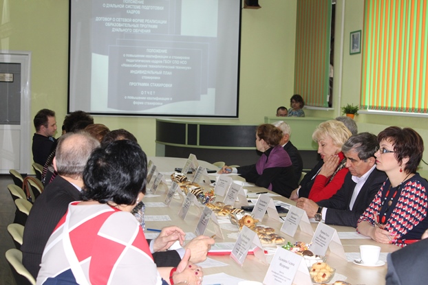В ходе заседания обсуждался ряд вопросов. Заместитель директора НТМиМ Гульнара Гусмановна Сорокина выступила с докладом о прохождении производственной и преддипломной практики студентов нашего техникума на предприятиях Новосибирска. В своём докладе она подчеркнула, что 78 % студентов проходят практику на предприятиях социальных партнёров техникума: на «Элсибе», «СИБИАРе», Сибирском заводе металлоконструкций, Металлургическом заводе им. Кузьмина, на заводе «Сиблитмаш». Директор нашего техникума Галина Фёдоровна Талюкина рассказала об итогах Национального чемпионата по профессиональному мастерству «WorldSkills Russia 2014», который недавно проходил в Казани. И хотя Новосибирск впервые участвовал в таком масштабном конкурсе, но его итоги впечатляют: сборная Новосибирской области боролась за звание лучшего по 10 компетенциям, в 7-ми из них вошла в число призеров.