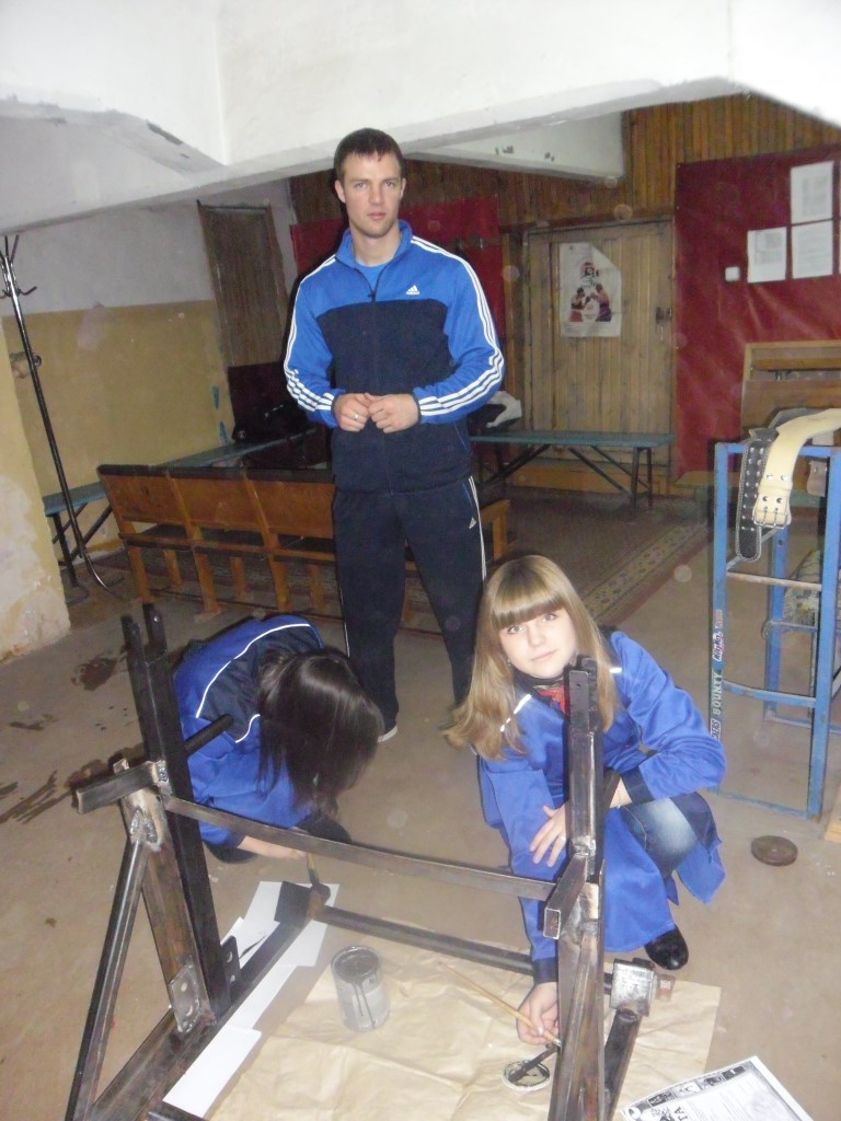 Анатолий Анатольевич проявил инициативу в создании проекта, у него возникла идея творческого подхода к организации учебной практики, а именно: создавать что- то полезное для самих студентов, для колледжа. Совместно с мастером производственного обучения Романом Михайловичем Малаховым были организованы студенты групп: С- 111, С – 112. У заместителя директора по производству Синекова Сергея Петровича ребята взяли остатки «делового» металла и электроды. «На хорошее дело» - сказал он, - «не жалко!» В глаза попалась старая советская ржавая металлоконструкция непонятного назначения, в которой студенты разглядели заготовку для стойки. Затем возникла идея- изготовить несколько тренажеров для спортивного зала, в которых нуждаются преподаватели физической культуры и сами студенты нашего колледжа. Так, воодушевившись идеей, студенты разработали тренажер, и за две недели вместе с Романом Михайловичем изготовили его. Студентам групп С-111, С – 112 очень пригодились слесарные навыки. Ребята сначала долго очищали станину от ржавчины, затем вырезали из разного профиля необходимые детали и сваривали их ручной дуговой сваркой. Для контроля процесса сварочных работ было решено привлечь контролеров группы К – 341 (куратор Погребняк Ольга Андреевна). Пономарева Кристина и Сурдал Даша в процессе изготовления стойки нарисовали технический рисунок для дальнейшего перевода в Cad систему «Компас» и технического оформления, затем занялись покрасочными работами. Получилась стойка для упражнений со штангой. На ней предусмотрены подставки под штанги и блины.