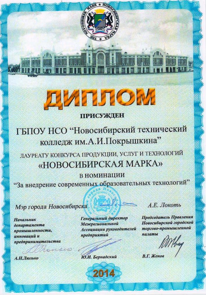 Наш колледж принимает участие в конкурсе четвертый год. В этом году мы, Новосибирский технический колледж им. А. И. Покрышкина, стали Лауреатами «Новосибирской марки» в номинации «За внедрение современных образовательных технологий».