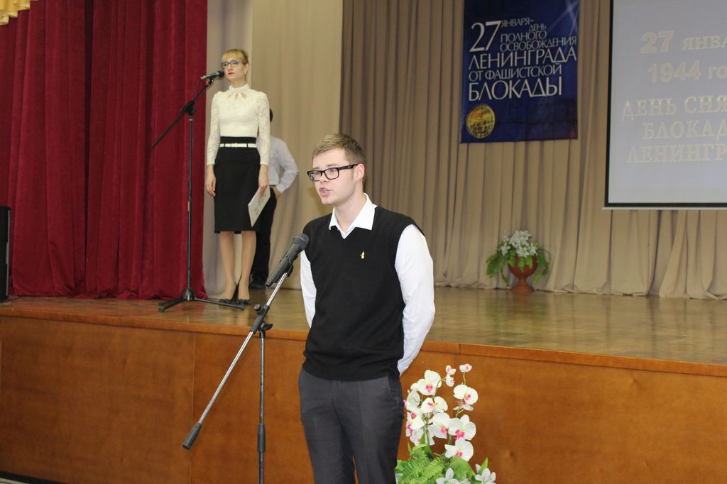 В начале встречи перед собравшимися выступила Татьяна Александровна Звягина, заместитель начальника управления, начальник отдела профессионального образования Министерства труда, занятости и трудовых ресурсов Новосибирской области. От имени министра Игоря Викторовича Шмидта она поздравила всех собравшихся в зале с великой датой – очередной годовщиной полного освобождения Ленинграда от фашистской блокады, пожелала всем ветеранам и блокадникам здоровья, а студентам – достойно продолжать дела, основы которых были заложены нынешними ветеранами - беречь Родину, любить свою профессию, помнить тот подвиг, который совершили советские люди в годы Великой Отечественной войны.