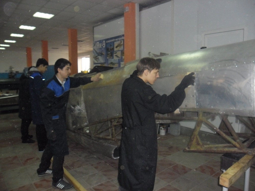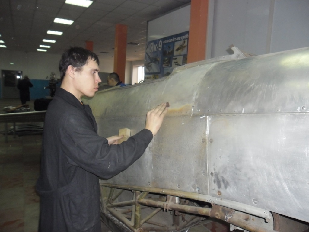 К середине следующей неделе все детали самолета должны просохнуть, сразу же можно будет выявить все неровности в шпатлевке и все зазоры между листами, которые сразу же будут шпатлевать. Первый слой закроет недоработки, а второй станет выравнивающим, основой для проведения покрасочных работ. Эта работа требует ювелирной точности, больших стараний и тщательного подхода. Безусловно, что все эти качества присущи каждому, кто задействован в реставрации ЯК-9. На данном этапе наряду со взрослыми в реставрационной мастерской трудятся студенты групп первого курса: М-151 и ТГ-191. А студенты: Котов Антон (Э-221) и Дементьев Денис (Э-321) проводят в мастерских все время, свободное от учебы, вкладывая в воссоздание самолета все силы.
