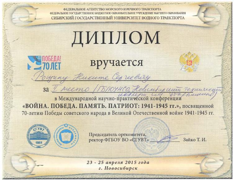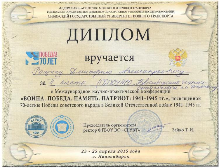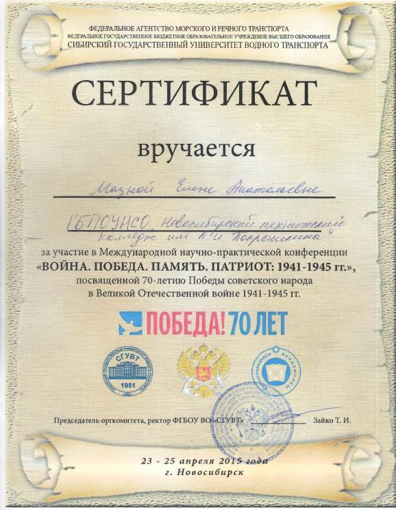 23-25 апреля 2015 года в Сибирском государственном университете водного транспорта состоялась Международная научно-практическая конференция «ВОЙНА. ПОБЕДА. ПАМЯТЬ. ПАТРИОТ: 1941 – 1945 гг.», посвящённая 70-летию Победы советского народа в Великой Отечественной войне 1941-1945 гг.
