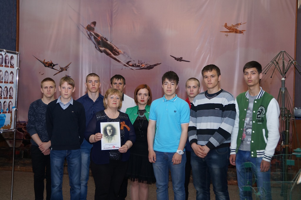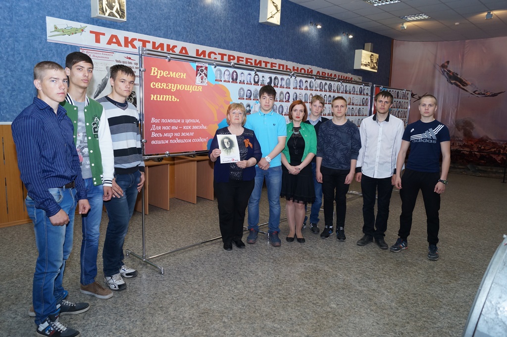 «Ветераны уходят от нас, время неумолимо. Сейчас эстафета сохранения памяти, в основном, лежит на плечах нас, детей послевоенного времени. Но ваша помощь, молодежи, очень нужна. Давайте собирать информацию о своих родных, которые воевали: фотографии, описания их боевого и послевоенного пути и приносить в колледж для того, чтобы увековечить подвиг наших солдат на той страшной войне».