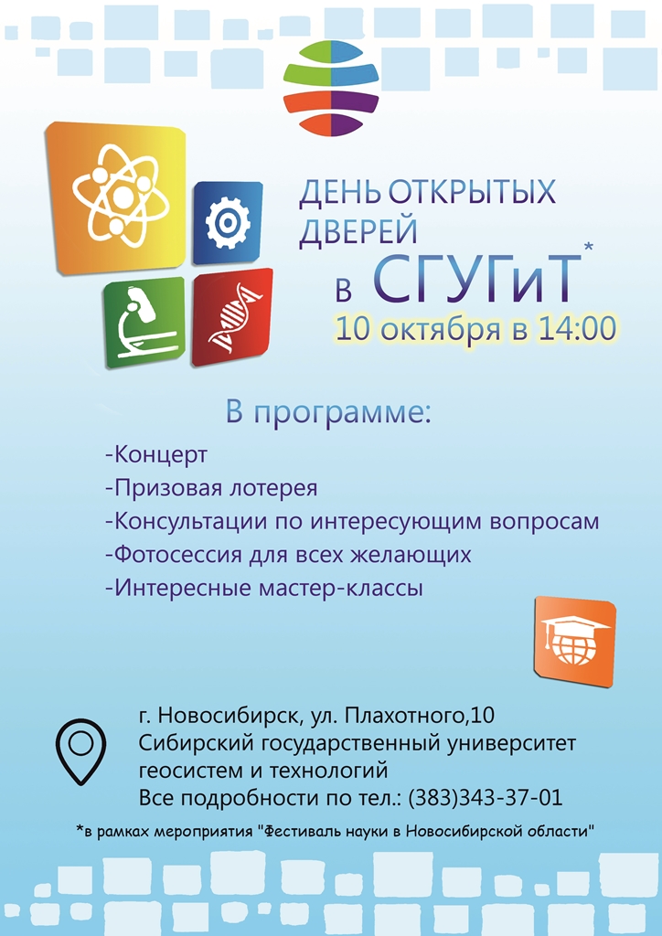 Торжественная часть в актовом зале Презентации специальностей и направлений СГУГиТ Выступление коллективов университета Розыгрыш призовой лотереи |