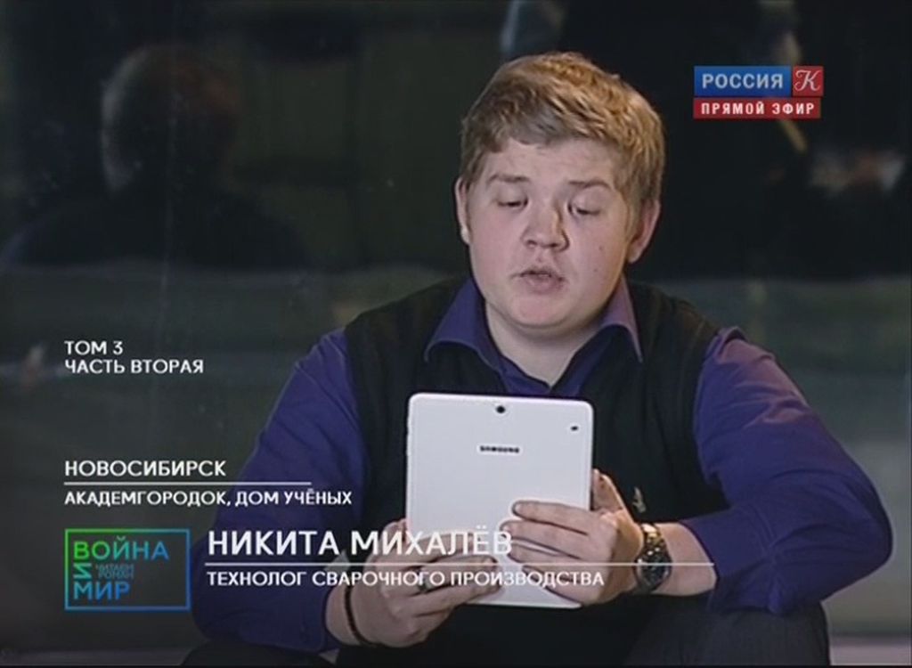 Студент Новосибирского технического колледжа им. А.И. Покрышкина Никита Михалев , будущий техник сварочного производства, принял участие в одном из самых масштабных событий Года литературы в России, это проект медиахолдинга ВГТРК «Война и мир. Читаем роман», приуроченный к 150-летию написания великой эпопеи. В течение 60 часов в эфире государственных телеканалов «Россия К», радиостанции «Маяк», а также в сети Интернет идет прямая трансляция чтения произведения, которое принесло Льву Толстому всемирную славу. По масштабности эта акция не имеет аналогов в мире – роман будет прочитан от первой до последней страницы. Чтения запланированы на 8, 9, 10 и 11 декабря 2015 года, по одному тому романа в день. Старт чтения каждого из томов – в 10 утра по московскому времени. . Всего будет задействовано более 1300 чтецов . В трансляции примут участие многие города страны и мира, расположенные в разных часовых поясах: Москва, Санкт-Петербург, Нижний Новгород, Смоленск, Вологда, Казань, Грозный, Владивосток, Хабаровск, Пятигорск, Омск, Новосибирск, Екатеринбург, Уфа, Ростов-на-Дону, Самара, Сочи, Ярославль, Берлин, Париж, Вена, Пекин, Вашингтон и пр. Политики, актеры, ученые, режиссеры, учителя, инженеры, врачи, рабочие, школьники и студенты, все, кто любит «Войну и мир» в нашей стране и за ее пределами на четыре дня объединятся в этом проекте, чтобы зазвучали на весь мир страницы великой книги. Никита Михалев был приглашен для участия в этом проекте, как победитель областного конкурса чтецов, который проходил в прошлом году в рамках фестиваля «Я вхожу в мир искусств!». 10 декабря в 20.30. студенты и преподаватели колледжа ,с интересом прильнув к экранам телевизоров, слушали, как Никита читал отрывок из романа «Война и мир». «Прочитал на «Отлично» !» - прокомментировала выступление своего студента преподаватель литературы Ольга Александровна Румянцева.