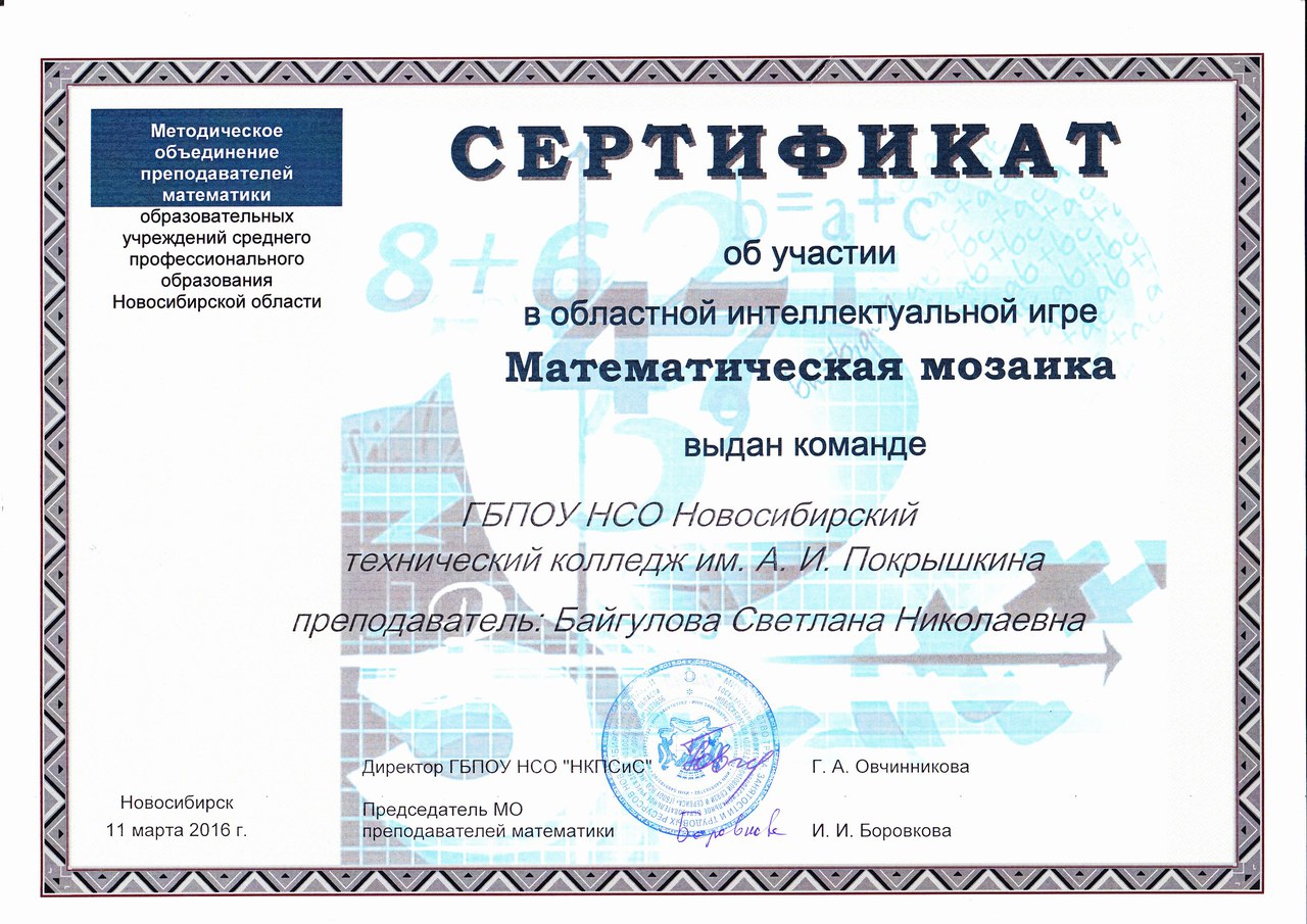 По итогам игры преподаватель математики и команда получили сертификат об участии в областной интеллектуальной игре «Математическая мозаика».