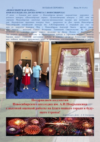 15.06.2023 о занесении имени нашего колледжа на Доску Почета г. Новосибирска.