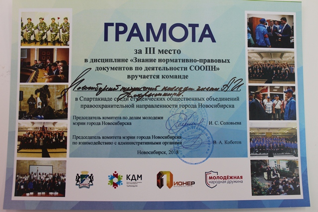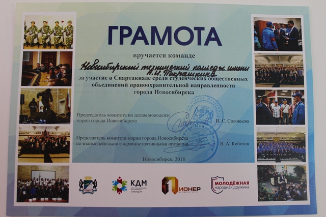 Добровольно-молодежная дружина нашего колледжа приняла участие в Спартакиаде среди студенческих общественных объединений правоохранительной направленности средних профессиональных образовательных учреждений города Новосибирска.