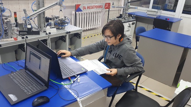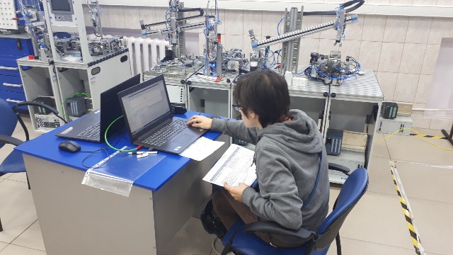За два часа учащиеся школ познакомились с основами монтажа, сборки, пуско-наладке и программированию производственных линий и роботов. Выполнили профессиональные задания на мобильных станциях под руководством наставника-студента колледжа Киснер Якова.