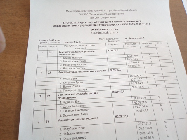 6 марта 2019 года Департаментом физической культуры и спорта, НРГОО ФСО «Юность России» в городе Новосибирске проводилось первенство по лыжным гонкам среди студентов СПО. Было заявлено 18 команд.
