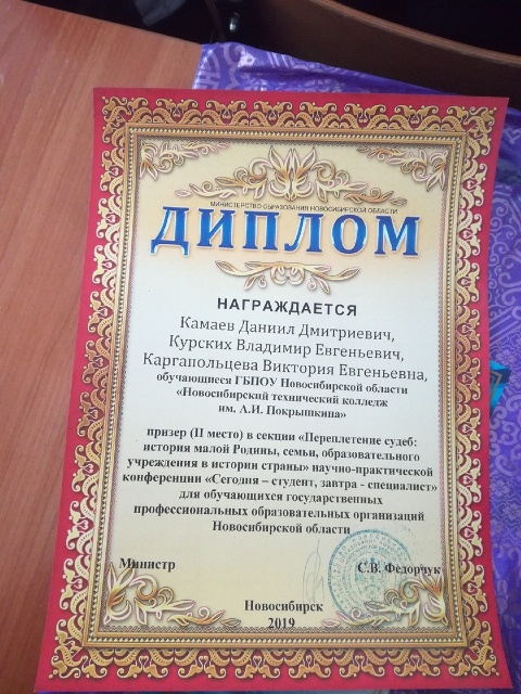 В рамках конференции была организована работа трех секций, выступающих было много. Наши студенты представили исследовательский проект «ОН ПОСВЯТИЛ СВОЮ ЖИЗНЬ ПРОФЕССИОНАЛЬНО – ТЕХНИЧЕСКОМУ ОБРАЗОВАНИЮ. ВЕНИАМИН НИКОЛАЕВИЧ ГОЛОВИН В ИСТОРИИ «НОВОСИБИРСКОГО ТЕХНИЧЕСКОГО КОЛЛЕДЖА ИМЕНИ АЛЕКСАНДРА ИВАНОВИЧА ПОКРЫШКИНА», ребята выступали в секции: «ПЕРЕПЛЕТЕНИЕ СУДЕБ: ИСТОРИЯ МАЛОЙ РОДИНЫ, СЕМЬИ, ОБРАЗОВАТЕЛЬНОГО УЧРЕЖДЕНИЯ В ИСТОРИИ СТРАНЫ».