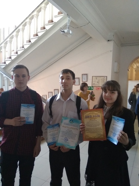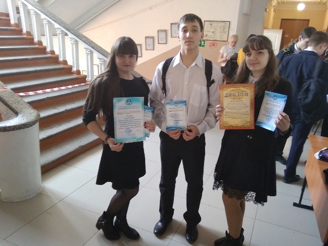 28 марта 2019 года студенты: Каргапольцева Виктория (группа К- 242), Камаев Даниил (группа С-211), Курских Владимир (группа С-211) – научный руководитель Погребняк Ольга Андреевна, заняли второе место в областной студенческой научно - практической конференции «Сегодня – студент, завтра – специалист».