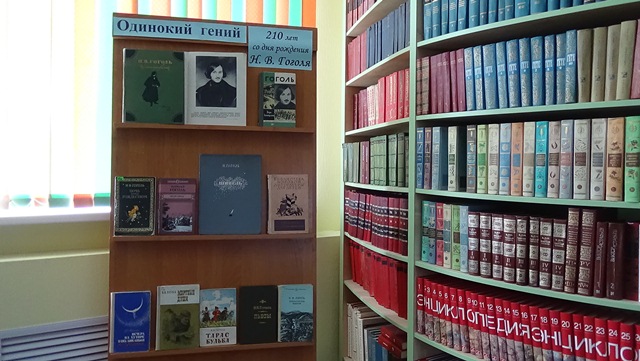 Николай Васильевич Гоголь - совершенно уникальный писатель, не похожий на других мастеров слова. В его творчестве много поразительного, вызывающего восхищение и удивление. Все его произведения отличаются своеобразием и особым колоритом. Гоголь, как никто другой, прекрасно сочетал в своем творчестве страшное и смешное, гротеск и сатиру, реальное и фантастическое. Особенно ярко это прослеживается в повестях и рассказах из цикла "Вечера на хуторе близ Диканьки", в повести "Вий", в "Петербургских рассказах". Именно эти произведения представлены на выставке «Одинокий гений» посвященной юбилею писателя. Кроме того на выставке размещены раритеты из фонда библиотеки колледжа - книга «Избранные произведения» Н. В. Гоголь 1959 года издания и книга «Шинель» Н. В. Гоголь 1952 года издания.