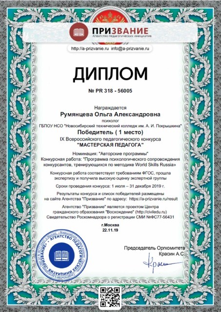 Поздравляем психолога колледжа Румянцеву Ольгу Александровну, победителя IX Всероссийского педагогического конкурса «МАСТЕРСКАЯ ПЕДАГОГА» в номинации «Авторские программы». Для участия в конкурсе была представлена авторская работа «Программа психологического сопровождения конкурсантов, тренирующихся по методике WorldSkills Russia». Данная работа, по заключению жюри конкурса, соответствует требованиям ФГОС, прошла экспертизу и получила высокую оценку экспертной группы. Работа опубликована в сборнике «Педагогическая теория и практика: актуальные идеи и успешный опыт в условиях модернизации российского образования» (г. Москва).