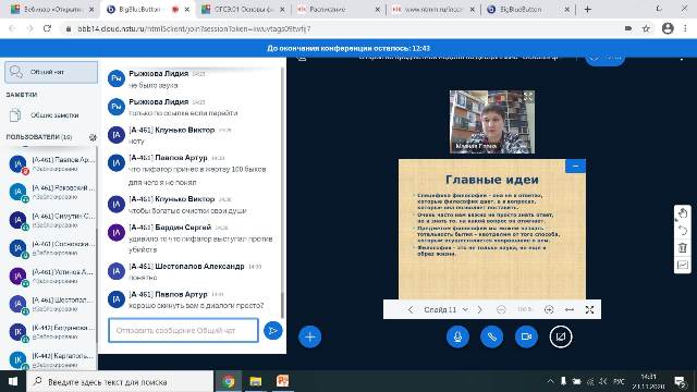 Студенты групп: А-461 и К-442 внимательно слушали лекцию «Философия на все времена» и отвечали на вопросы по теме. Во время занятия студенты узнали, чему посвящена неделя философии, какие викторины и конкурсы их ожидают. Прослушали правила использования вебинаров на занятии в программе Dispace.