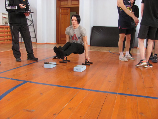 Отбор проводился по следующим номинациям: прыжок в длину с места, подтягивание на перекладине, удержание уголка на пресс на брусьях, толчок двух гирь 12 кг. и в общем зачете.