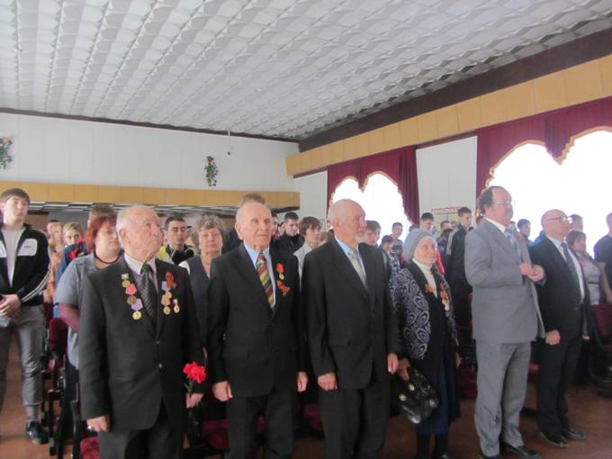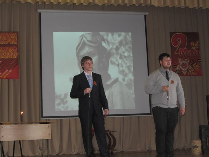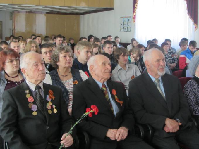 250 выпускников и работников техникума ушли добровольцами на фронт, Многие из них были награждены орденами и медалями. Трое получили звание Героя Советского Союза - это Габов Евгений Григорьеви, Домбровский Иван Александрович, Осинный Иван Иванович. А Александр Иванович Покрышкин стал трижды Героем Советского Союза. Обо всем об этом вспоминали ветераны, и, глядя на наших студентов, выступающих на сцене, вспоминали они и о том, как были молодыми, и как встречали тот первый, самый долгожданный День Победы.