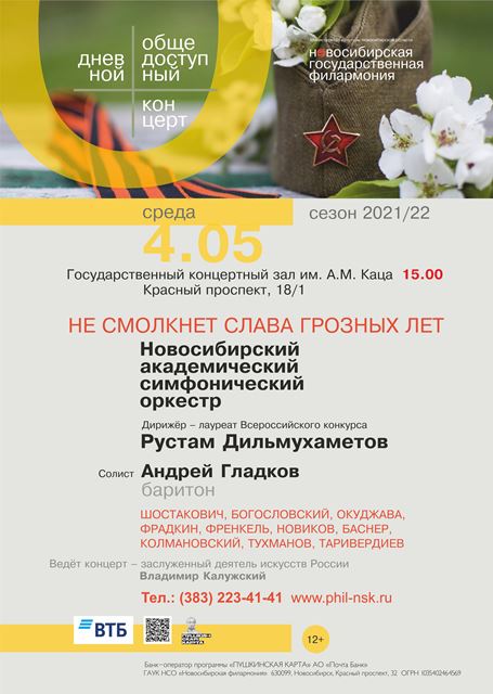 4 мая в 15:00 в Концертном зале имени А. Каца пройдет дневной общедоступный концерт, в котором Новосибирский академический симфонический оркестр исполнит музыку Шостаковича, Баснера, Фрадкина, Таривердиева, Агапкина, Богословского, Новикова, Окуджавы, Френкеля и Тухманова.
