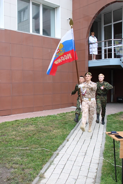 Почетное право внести Государственный флаг Российской Федерации было предоставляется студентам группы СВ 114: Мамышеву Никите, Бекирову Нариману, Миронову Георгию. На флаг во время митинга была надета траурная ленточка как знак скорби.