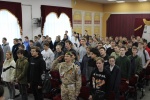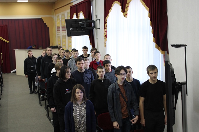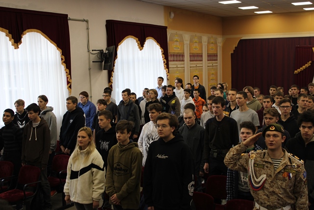 Участники проекта «Знаменная группа колледжа» в актовом зале исполняли Гимн перед остальными студентами, задавая тон всему мероприятию.