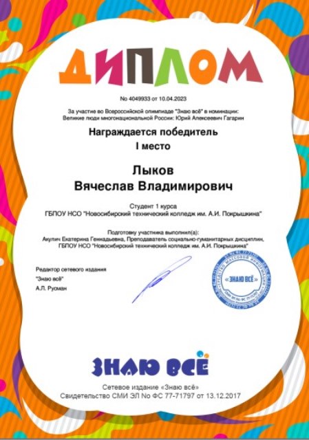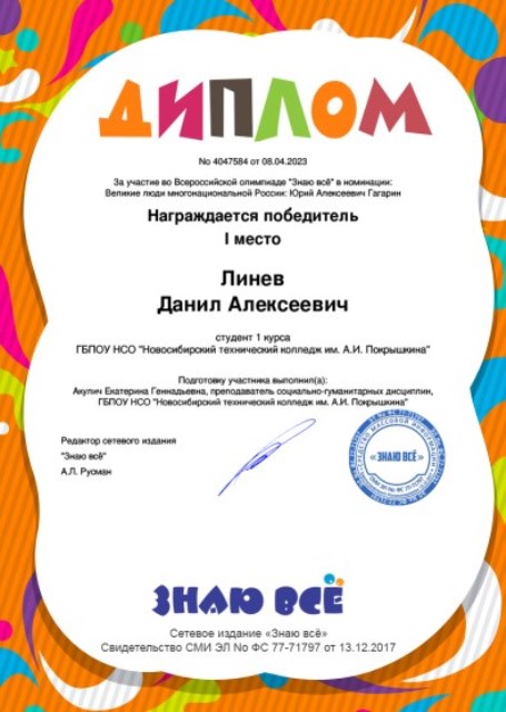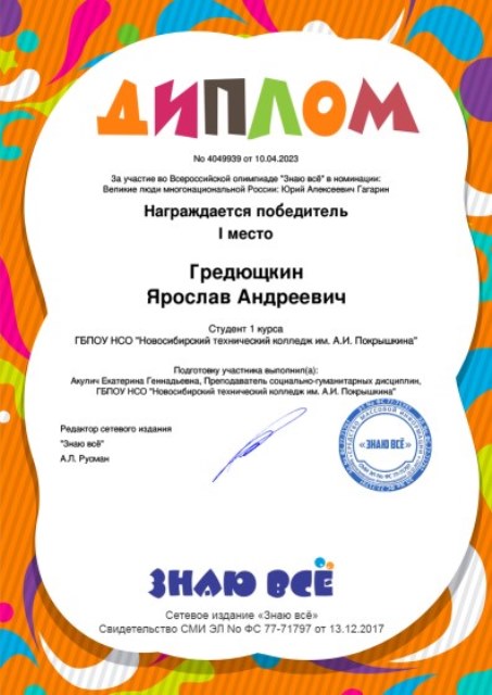 ПОЗДРАВЛЯЕМ ПОБЕДИТЕЛЕЙ ВСЕРОСИЙСКОЙ ОЛИМПИАДЫ «ЗНАЮ ВСЕ» В НОМИНАЦИИ: «ВЕЛИКИЕ ЛЮДИ МНОГОНАЦИОНАЛЬНОЙ РОССИИ: ЮРИЙ АЛЕКСЕЕВИЧ ГАГАРИН»