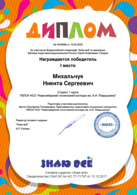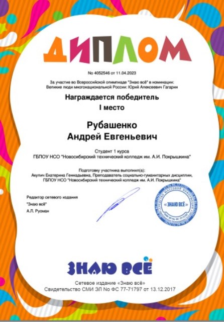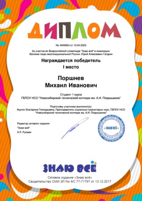 Студенты нашего колледжа не остались в стороне от этого знаменательного события и под руководством куратора Акулич Екатерины Геннадьевны приняли участие во Всеросийской олимпиаде «Знаю все» в номинации: «Великие люди многонациональной России: Юрий Алексеевич Гагарин». Правильно ответив на вопросы о полете Ю.А. Гагарина и его биографии студенты заняли первые места.