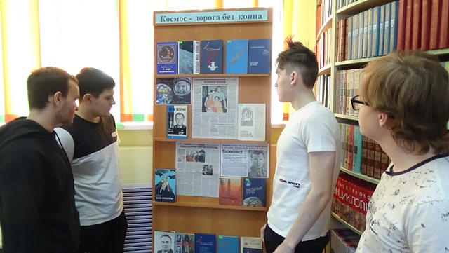 Информационным сопровождением мероприятия стала книжно-иллюстративная выставка «Космос – дорога без конца», на которой представлены книги из фонда библиотеки и публикации из печатных изданий о космосе и космонавтах.