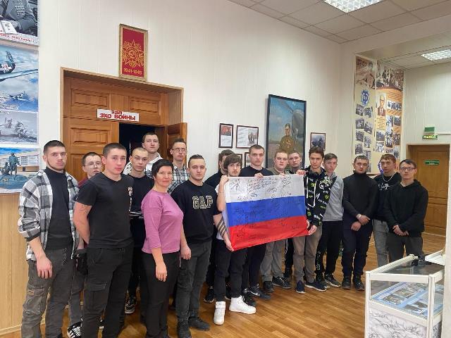 У экспозиции, посвященной СВО, сфотографировались с Флагом РФ, которое передано нашему музею с передовой СВО. Все остались довольны, отмечая высокую организацию экскурсии.