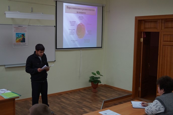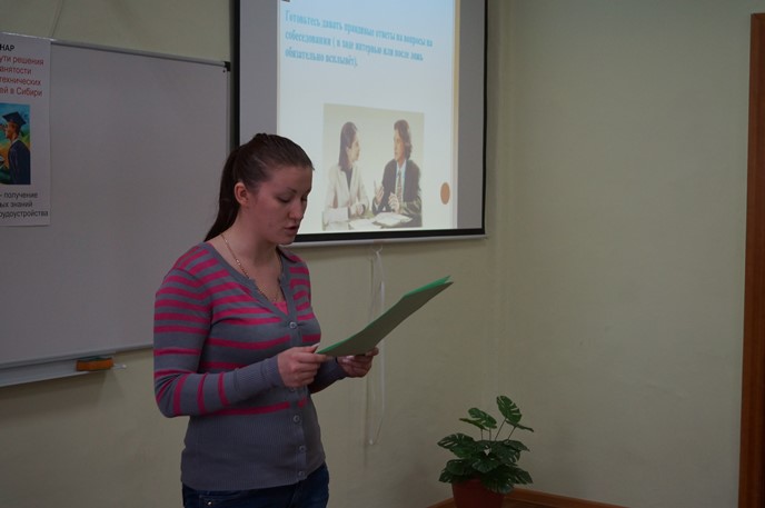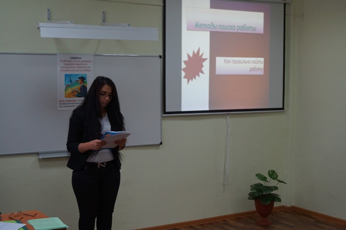 А ребята из группы П-331 провели семинар «Проблемы и пути решения трудовой занятости выпускников технических специальностей в Сибири». На этом занятии присутствовали студенты нескольких групп: К-241, С-411, Э-421. В ходе семинара ребята получили очень важную и необходимую в дальнейшем информацию. Преподаватель Вера Вениаминовна Дмитриева рассказала, с какими проблемами сталкиваются наши выпускники при устройстве на работу. Студенты П-331выступили с докладами, тематика которых была очень актуальна. Так, Дегтярёв Павел рассказал о жизненных планах выпускников, а Богданов Руслан ознакомил с правилами составления резюме. Машанова Юлия и Голубева Анастасия раскрыли «секреты» успешного собеседования, Эйвазова Айтель и Галкина Дарья рассказали о методах поиска работы. В конце семинара преподаватель Валерий Николаевич Скрипников проинформировал, как пользоваться сайтами по трудоустройству, которых сейчас очень много.
