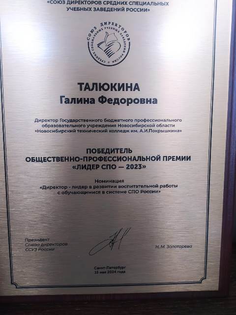 Директор Новосибирского технического колледжа им. А.И.Покрышкина Галина Федоровна Талюкина стала победителем Премии «Лидер СПО - 2023» в номинации «Директор — лидер в развитии воспитательной работы с обучающимися, в системе среднего профессионального образования России». Премия «Лидер СПО -2023» учреждена Общероссийской общественной организацией «Союз директоров средних специальных учебных заведений России». Традиционно она выявляет и популяризирует успешные практики развития системы СПО, поощряет профессионалов, содействует квалификационному росту педагогических и управленческих работников системы СПО, научных работников, государственных и общественных деятелей. В соответствии с положением об общественно-профессиональной премии «Лидер СПО России» Талюкиной Галине Федоровне вручена Почетная медаль «Лидер СПО России».