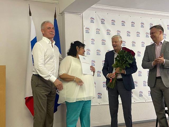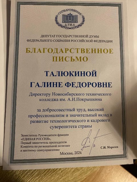 Сергей Иванович Морозов вручил Благодарственное письмо директору колледжа Г.Ф.Талюкиной за ее преданность профтеху, веру в ребят, любовь к стране.