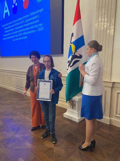 19 декабря в ходе встречи с командой Новосибирской области, принимавшей участие в финале Национального чемпионата по профессиональному мастерству среди инвалидов и лиц с ограниченными возможностями здоровья «Абилимпикс», заместитель Губернатора Новосибирской области Валентина Дудникова и министр образования региона Мария Жафярова вручили награды победителям, призерам и их наставникам.